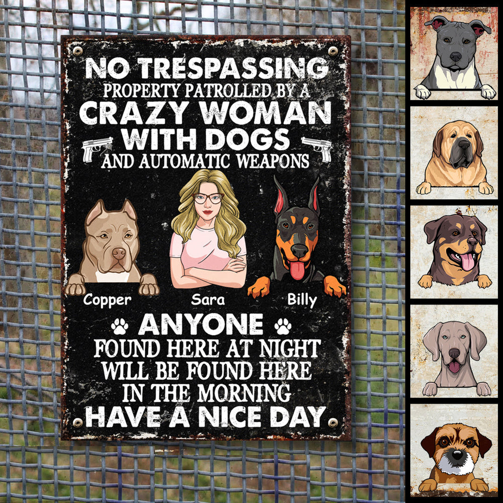 Warning Metal Yard Sign, Gifts For Dog Lovers, No Trespassing Property Patrolled By A Crazy Woman With Dogs